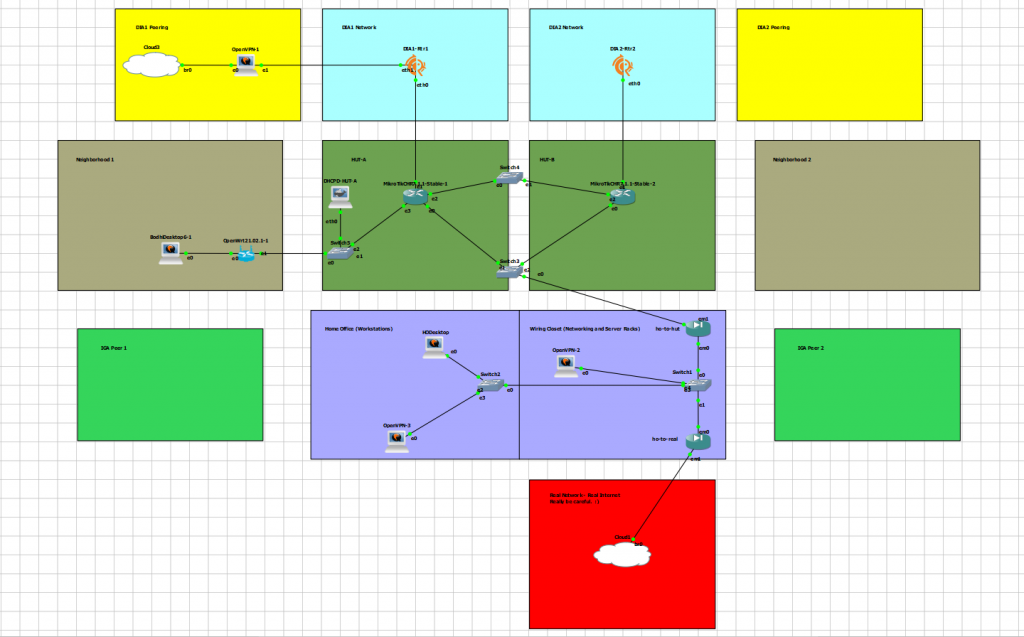 The dark green blocks are my data / transport centers. I am currently running MikroTik as it is probably the best lab router there is. It can handle all the protocols I need in one neat package for little to no cost. I have experimented with using OpenBSD and FRR, Nokia SR-Linux (this has a FASCINATING tale behind it regarding how I managed to implement the system “in GNS3”), and Linux with FRR, but they all are lacking in one or two protocols only found in one of the others. Nokia SR-Linux came the closest as an alternative, as it can at least handle SIMILAR protocols, but I’m trying to represent a very specific environment, and in that environment I need: BGP, VPRN, VPLS, VRRP, and OSPF.
